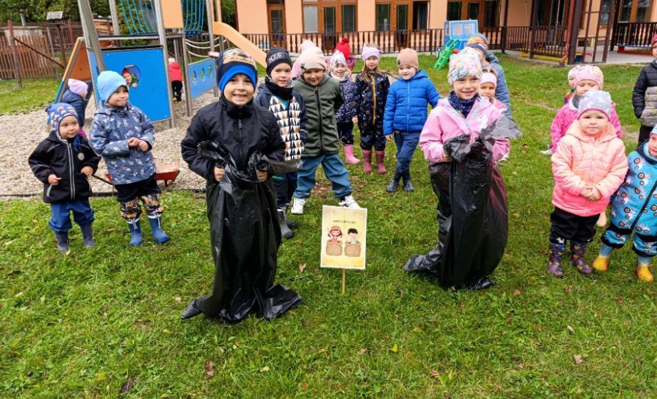 Následně jsme se přesunuli ven, kde byla připravena čtyři soutěžní stanoviště. Na zahradě se střídalo vození koleček plných brambor ve dvojicích, skákaní v pytlích, házení brambor do košíku a nakonec i hledání brambor v písku. Všichni soutěžící si zasloužili obrovskou pochvalu za nadšení i týmového ducha.