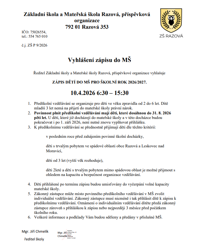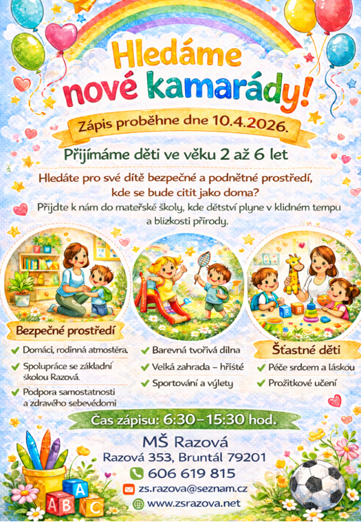 Začátek něčeho nového – to jsou vždy dny spojené s konáním zápisů do školy. Letos se u nás na škole konal ZÁPIS DĚTÍ DO 1.ROČNÍKU ve čtvrtek 12.února 2026.